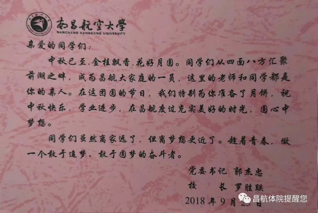 中秋佳节,美词配美月似乎还仅仅不够。有人说,只有在得到精神和味蕾的双重满足之后,才算是对中秋佳节的完整纪念。在这个团圆的日子里,昌航体院大家庭齐聚一堂,不仅校领导心系未归家的学生,送来声声问候和惦念,学院院领导也为大家献上深深地祝福,真心祝愿昌航体院这个大家庭里的每一个孩子都能平平安安,走的更远,飞的更高!