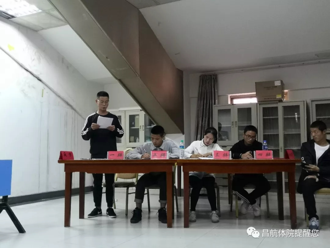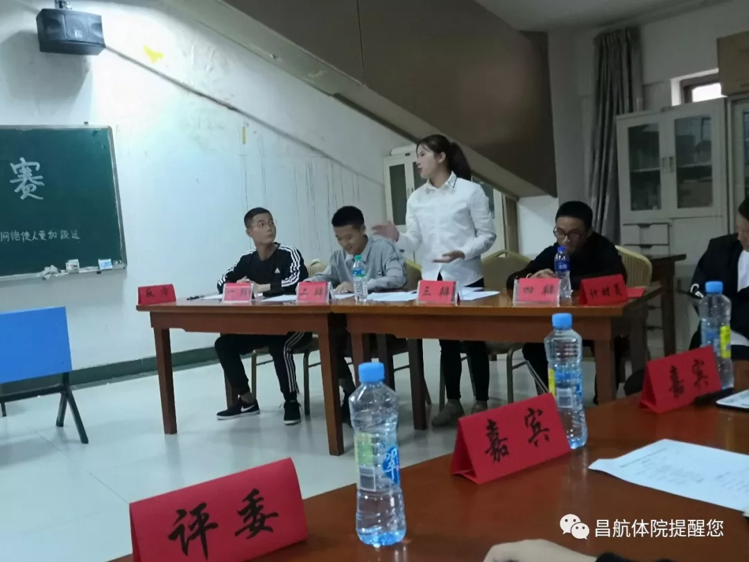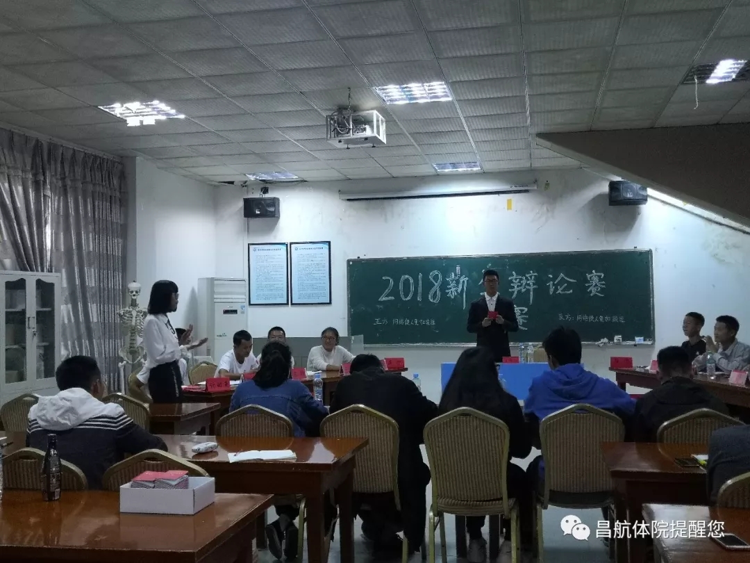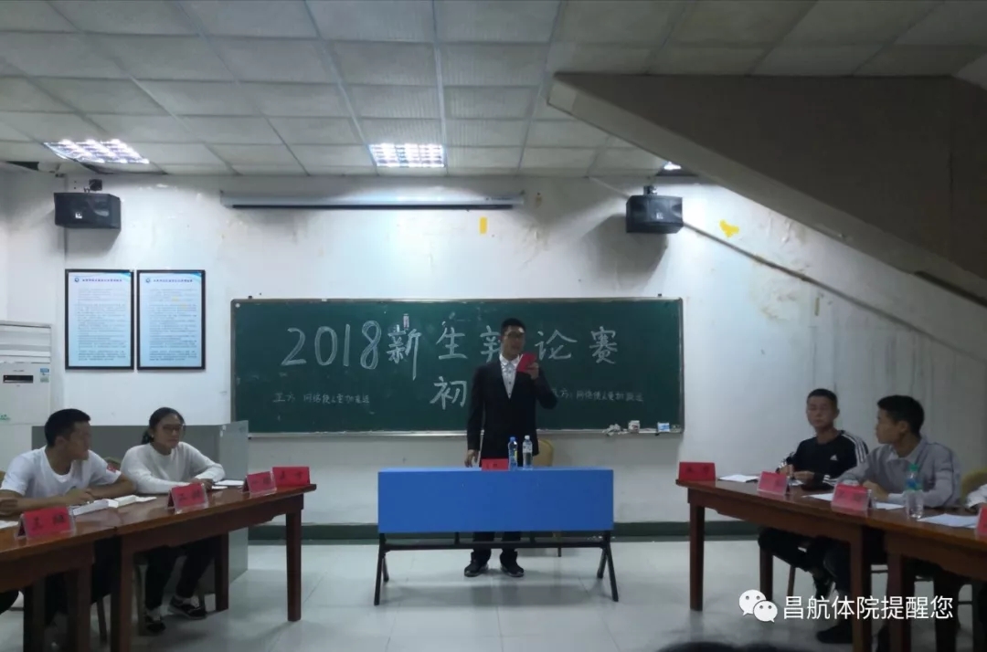 2018年10月25日下午15:30,南昌航空大学体育学院2018级新生辩论赛在田径场解剖室隆重举行。本场新生辩论赛主持人是18级新生华浩放,担任评委的是体育学院团委学生会副主席李晓慧和17级学生胡童昕,作为嘉宾人员出席的是第二团委副书记朱德泉,新媒体部部长黄思婷,学习兼科创部部长贺星宇。